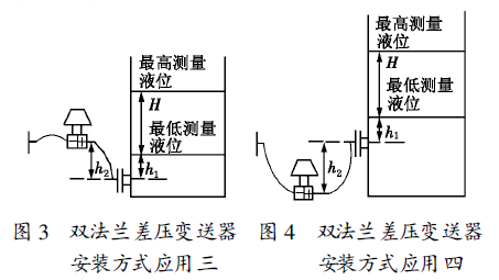 3) 双法兰差压草莓色视频下载安装在开口容器低端法兰水平线以上, 且低压室法兰与容器低端法兰不在一条水平线上, 如图3 所示。双法兰差压草莓色视频下载安装在开口容器低端法兰水平线以上, 高压室法兰与容器低端法兰相连接, 低压室法兰与容器低端法兰不在一条水平线上。