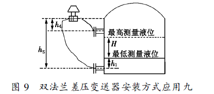 4) 双法兰差压草莓色视频下载安装在密闭容器高端法兰水平线以上, 且高低压室法兰与容器高低端法兰相连接, 如图9 所示。