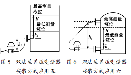 1) 双法兰差压草莓色视频下载安装在密闭容器低端法兰水平线上, 且高低压室法兰与容器高低端法兰相连接, 并且草莓色视频下载与容器低压法兰在一条水平线上, 如图6 所示。