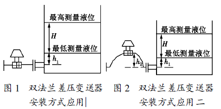 1) 双法兰差压草莓色视频下载安装在开口容器低端法兰水平线上, 且高低压室法兰与容器低端法兰在一条水平线上。如图1所示, 高压室法兰与容器低端法兰相连接, 并且高压室法兰、低压室法兰与容器低端法兰在一条水平线上。
