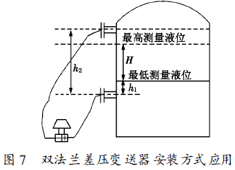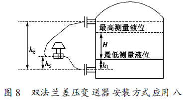 3) 双法兰差压草莓色视频下载高低压室法兰与容器高低端法兰相连接, 并且草莓色视频下载安装在密闭容器高低端法兰水平线之间, 如图8所示。